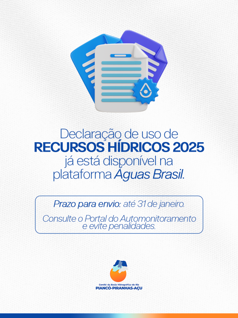 Declaração de Uso de Recursos Hídricos (DURH) referente ao ano de 2025 já está disponível para preenchimento na plataforma Águas Brasil. 27/01/2026 17:39 Leia mais